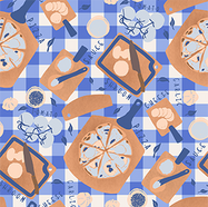 Uma linda mesa montada sobre uma toalha xadrez. É dia de pizza! Elementos para o preparo da pizza desenhados cuidadosamente sobre um estampado xadrez delicado.