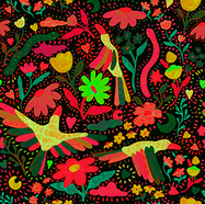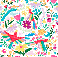 Estampa tropical com elementos desenhados à mão e vetorizados. O arquivo inclui todas as amostras de cor.
