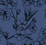 Estampa floral com elementos em estilo de pintura e paleta de cor fria.