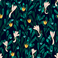 Estampa floral de um jardim noturno, com elementos originais de Madressilva, flor originária da Ásia. Uso de elementos feitos por Procreate e finalização no Photoshop Contém camadas com elementos separados. Cód LBiz2404